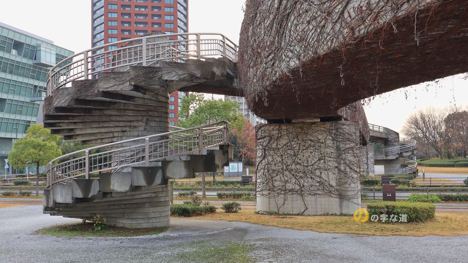 南側昇降階段。回転方向が両端同じ方向なのは螺旋階段歩道橋としては珍しい部類、南北どちらを向いているか一瞬迷う。