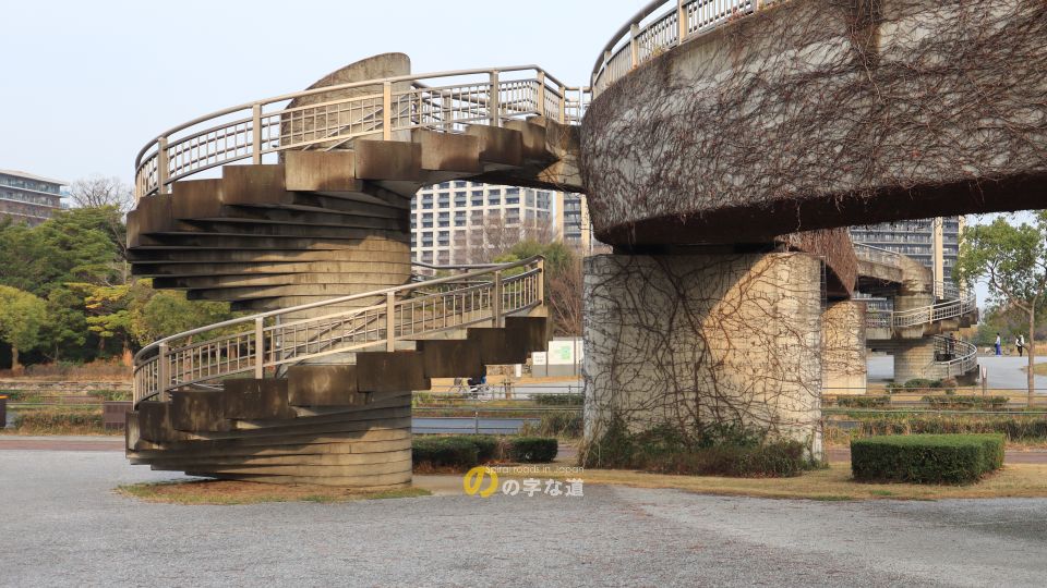 螺旋階段は蹴上げと踏板が一体化された扇形のプレキャストセグメントを組み上げており、しいの木橋(千里D-E歩道橋)、桃山東橋/桃山西橋、希望丘歩道橋とほぼ同じ構造だ。1960年代の発想を2007年に蘇らせたのはどういう意図だろうか。