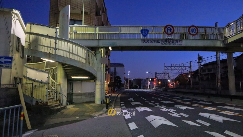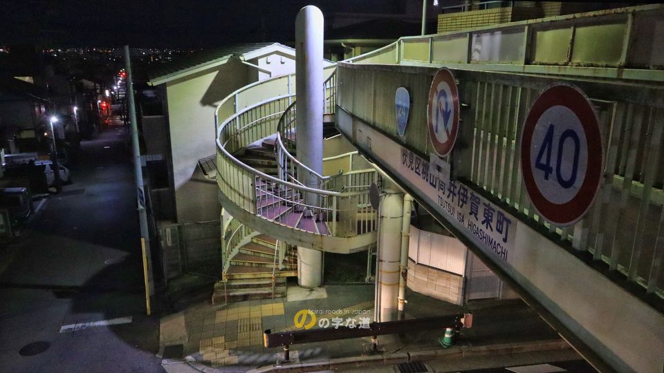 近鉄京都線丹波橋駅近くの国道24号に架かる横断歩道橋の西側昇降階段がループしている。付近は東山連峰の南端にあたり、西に向かって急な下り坂が続く。