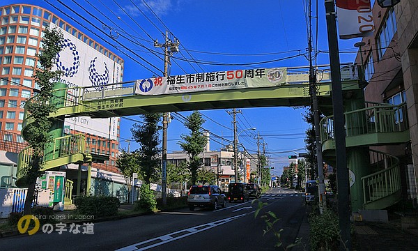 福生市役所前に架けられた横断歩道橋の両端昇降階段がループしている。いや、ループの途中で分岐があるので、当サイトの基準で言えば「のの字な歩道」ではない、ということになるかも。正式名称は「市役所前横断歩道橋」だが、それではどこにあるのかわからなくなるので、当サイトでは「福生市役所前横断歩道橋」と表記する。