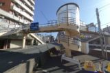 もくせい会館側昇降階段部拡大。歩道の通行空間確保に苦心した様子がうかがえる。路面に接するコンクリート階段部、単色なので遠近感を掴みにくいことへの対策か、注意喚起の黄色ペイントが施されている。