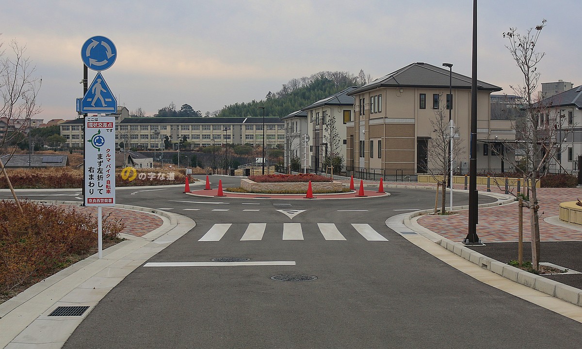 最近の大型分譲住宅地は住民の世代が適当に散らばる(=30年後に老人の街にならない)よう長期間かけて少しづつ販売する傾向にあり、ここ近鉄学研奈良登美ヶ丘住宅地も2013年1月から順次販売されている。2010年代に販売されたエリアには円形交差点に見える転回所(※)が2箇所あるが、今般の分譲エリアに設けられたラウンドアバウトも先の転回所と同様に街のアクセントとして設けられた印象だ。もっとも、ラウンドアバウトにすることによるデメリットは少ないので、設置を否定するものではないが。