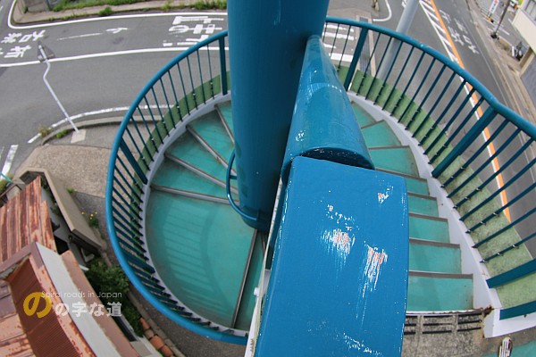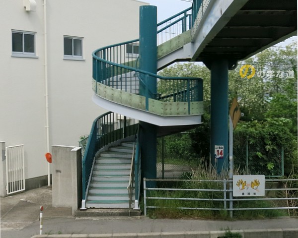 江津市役所の西側を通る国道9号に架けられた歩道橋の両端昇降階段がループしている。