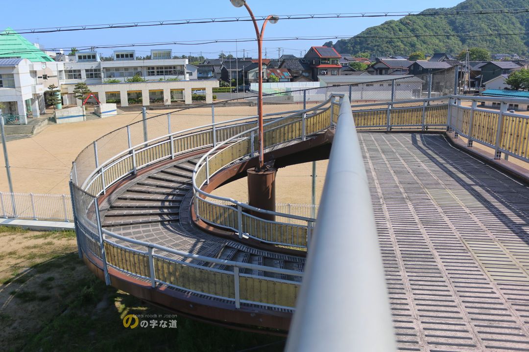 浜坂歩道橋の北側ループを眺める。県道127号浜坂港浜坂停車場線をまたぐ。