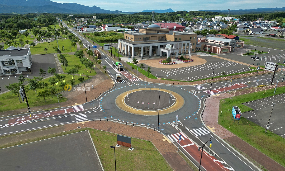 クッチャロ湖入口交差点空撮。道の駅上空から町役場方面を眺める。平日朝8時、通勤通学・現場へ向かう事業車・キャンプ場撤収車等で最も混雑する時間帯だろう。