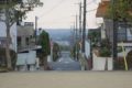 半田東村ミニロータリー交差点を東側(中高野街道の大阪側)から眺める。こちらから交差点へ進入する場合は一時停止の必要がない。交差点の中央に中央島の代わりとなるペイントが施されていて、その周囲を時計回りで通行するよう促しているが、実際の通行車両はそんなことお構いなしだ。写真正面、自動販売機の左側の非舗装路は民家の敷地か、それとも道路か。