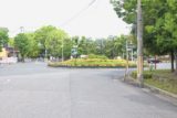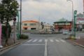 半田東村ミニロータリー交差点を北から眺める。東村はこのあたりの字名である。この位置にのみ警戒標識「ロータリーあり(201の2)」が設置されている。