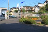 平山子坂ラウンドアバウトを西側から眺める。この写真の手前に、警戒標識「ロータリーあり(201の2)」が設置されている。