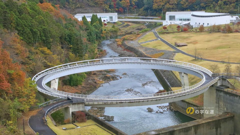 直径75m、幅2.75m。円形であるべき理由を見つけられないが故に、注目される橋である。背後のスプリングスひよしに架設された展望連絡橋も同様かも知れない。