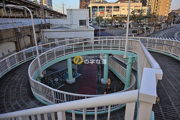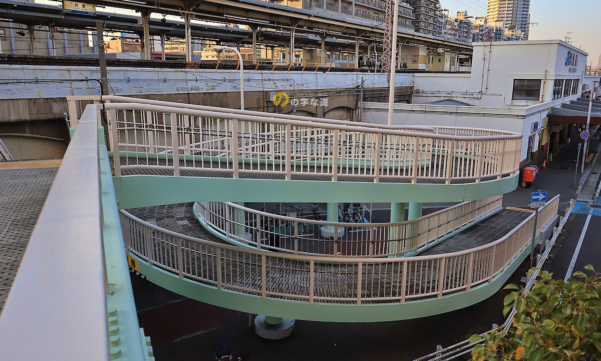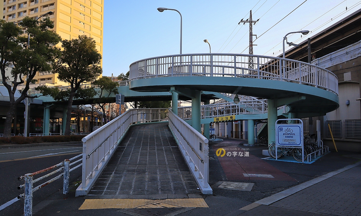 兵庫区文化センター等が入居する兵庫駅前ビル2階とJR山陽本線・兵庫駅を結ぶ横断歩道橋の一端昇降スロープがループしている。兵庫駅前ビルの2階に自転車を乗り入れることはできないので、車椅子やベビーカーを意識したものだろう。