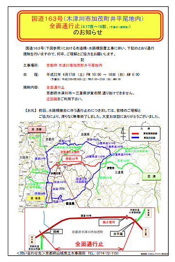 2010年4月17日(土)午後10時から18日(日)午前6時まで、国道163号を通行止めにして架設工事が行われた。その予告書が隣町の精華町のウェブサーバに残っていた。