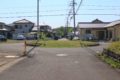 南東から眺める。団地内を東西に貫くメインストリートで、これが優先道路。こちらから進入する部外者車両は想定されていないのか、視線誘導標がない。