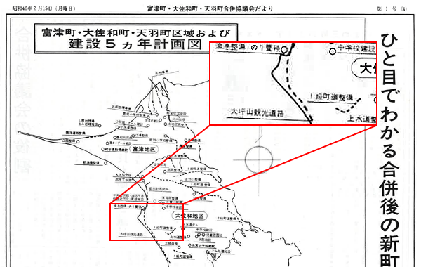 富津町・大佐和町・天羽町合併協議会だより 第1号(1971(昭和46)年2月15日)に「大坪山観光道路」なる計画線が引かれている。