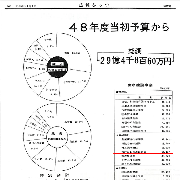 広報ふっつ 第12号(1973(昭和48)年4月1日)には、大佐和地区の建設事業として「大坪山観光道路新設」事業費64.4百万円とされている。