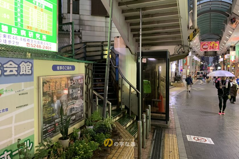 大山歩道橋西側昇降階段。階段の下に電話ボックス、いろいろと無理している。