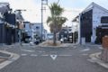 和泉砂川ロータリーを北側から眺める。以前は優先関係がはっきりしなかったが、2017年の交差点改修で「環道優先」を案内し、車線もそのように引き直された。