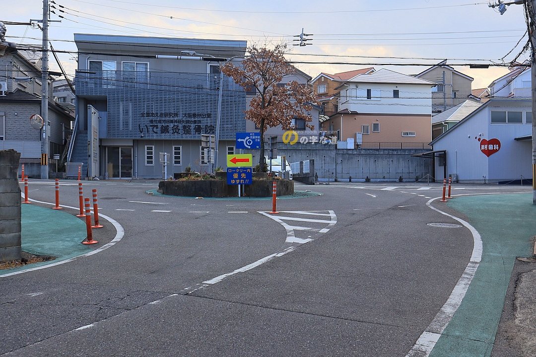 接続路いずれも一時停止規制されておらず、警戒標識「ロータリーあり(201の2)」も規制標識「環状の交差点における右回り通行(327の10)」もないのだが、2018年頃におそらく市が建てた「環道優先」の私設標識(看板)がある、極めてレアな交差点だ。