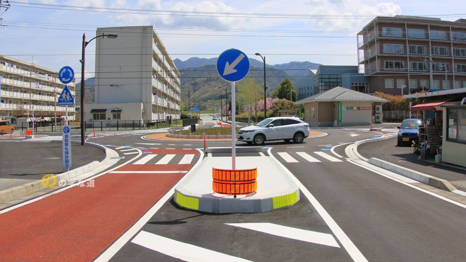 朝夕は通学児童や通勤通院車両等が多く信号機の設置を求める声が多かったが、全体交通量を考慮すると信号機の設置には至らなかった交差点。交通量の少ない交差点で信号機が無くても安全かつ円滑な交通と重大事故の削減が期待できるということで、社会資本整備総合交付金を活用してラウンドアバウト化したとのこと。