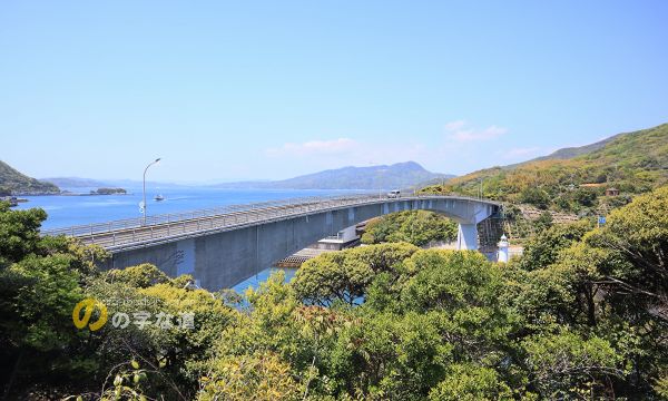昭和28年に制定された離島振興法に基づく離島振興事業により瀬戸内海に建設された橋の一端がほぼのの字を描いている。