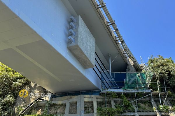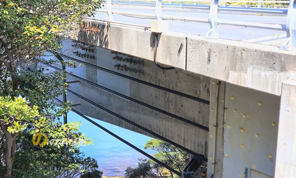 2020年に発生した事故復旧は桁と橋台を接続するグラウンドアンカーの強化が主策のようだが、それに加えてカーボンシートの貼付と外ケーブルによる補強工事も行われた。この写真は室津(本土)側の橋台。