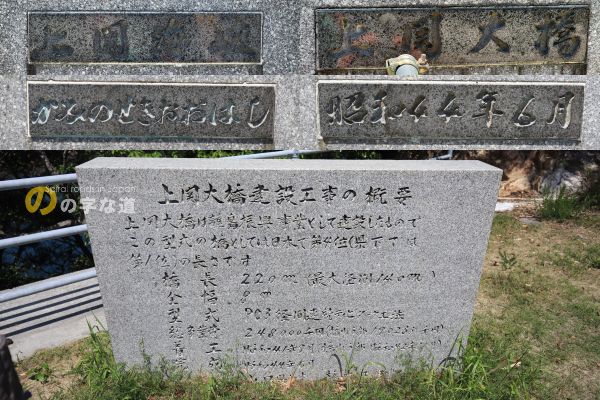 建設工事の概要が刻まれた碑が橋の南詰に置かれている。島が橋でつながるのは嬉しいことだという気持ちが溢れている。