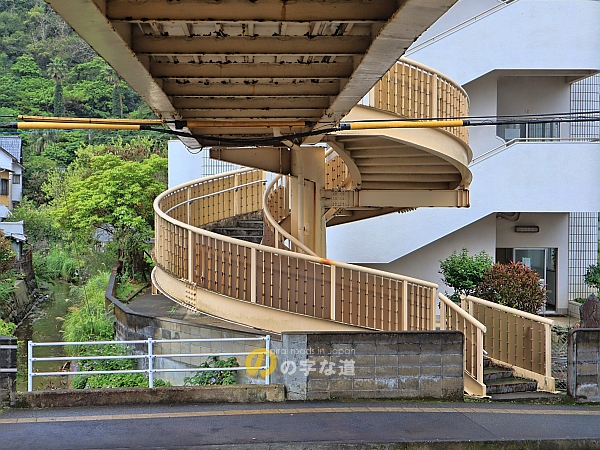 奄美大島にある横断歩道橋3基のうち1基、金久中学校の校舎と運動場を連絡する横断歩道橋の両端昇降階段がループしている。