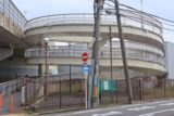 四條線横断歩道橋の北側斜路を路上から眺める。この角度ではループしている様子がわからない。