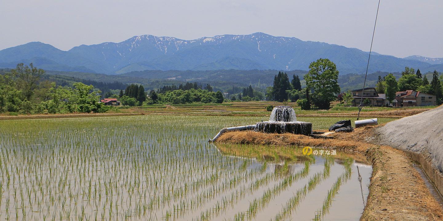 残雪の飯豊連峰と上奥田円筒分水工。