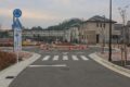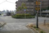 近鉄登美ヶ丘住宅地のロータリー交差点を東側(入口側)から眺める。この接続路のみ、2車線相当の幅員がある。一時停止の規制があるのもこの接続路だけだ。