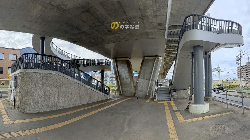 その事業計画書には「橋脚形状をV字にすることで桁下空間の視界に配慮し、地上部とこ線橋を結ぶ階段に曲線斜路付階段を設置する」と言及されるほど、この歩行者用階段は景観を意識したもののようだ。