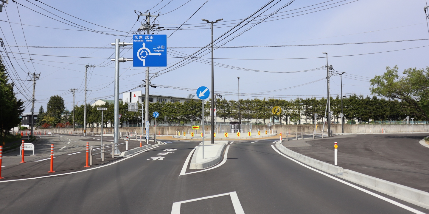 半導体製造のキオクシアが四日市工場に続く第2の製造拠点として北上工業団地に進出することになり、交通量の増加が見込まれること、とりわけ出退勤時のラッシュで交通渋滞が見込まれることから、信号機設置よりもラウンドアバウト化が効果的と判断されたようだ。当初は2021年度~2022年度の供用開始を目指していたようだが、どういう事情か2023年3月供用開始となった。一方、公安委員会による環状交差点指定は2022年8月3日だ。このタイムラグはなんだろう?