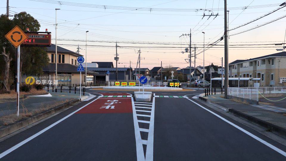 甲南地域市民センター前交差点を東側から眺める。警戒標識「ロータリーあり(201の2)」は全ての接続路に設置されている。