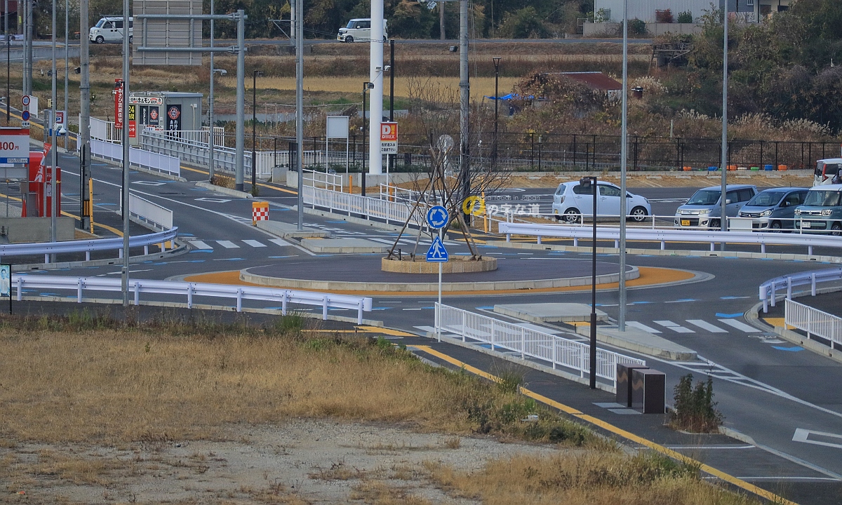 泉佐野市と熊取町の共同事業である熊取駅西地区整備事業は2016(平成28)年3月に都市計画を決定、その骨格となる府道62号泉佐野打田線(泉佐野市都市計画道路熊取駅西1号線)は2021(令和3)年5月27日に供用開始されており、この時点でラウンドアバウトとしての交差点整備は完了していた。