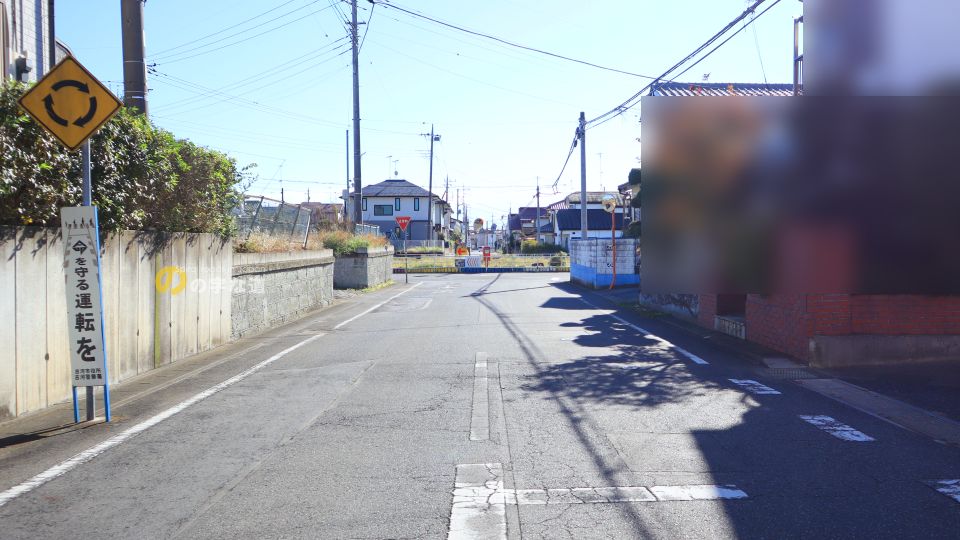 久能せせらぎ(配電盤住宅団地)ロータリーを北側から眺める。警戒標識「ロータリーあり(201の2)」は南北の接続路にのみ設置されている。
