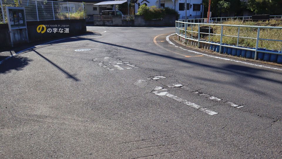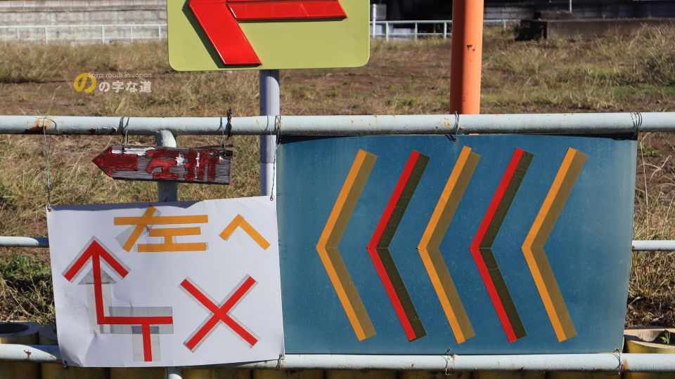 手書き感あふれる視線誘導標。公安委員会による一時停止の規制はあるものの、一方通行や指定方向外進行禁止の規制はない。関係者しか通行しない道路だから今まではそれでよかったのかも知れないが、世代が変わりつつあるんだからそろそろラウンドアバウトに改良してはどうだろう?