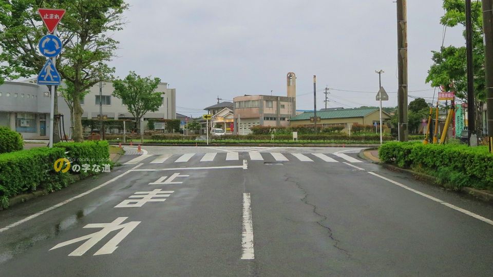 南東(市道大原潟下線)から北西方面を眺める。ラウンドアバウトとして運用されるようになってからも一時停止で規制されている。