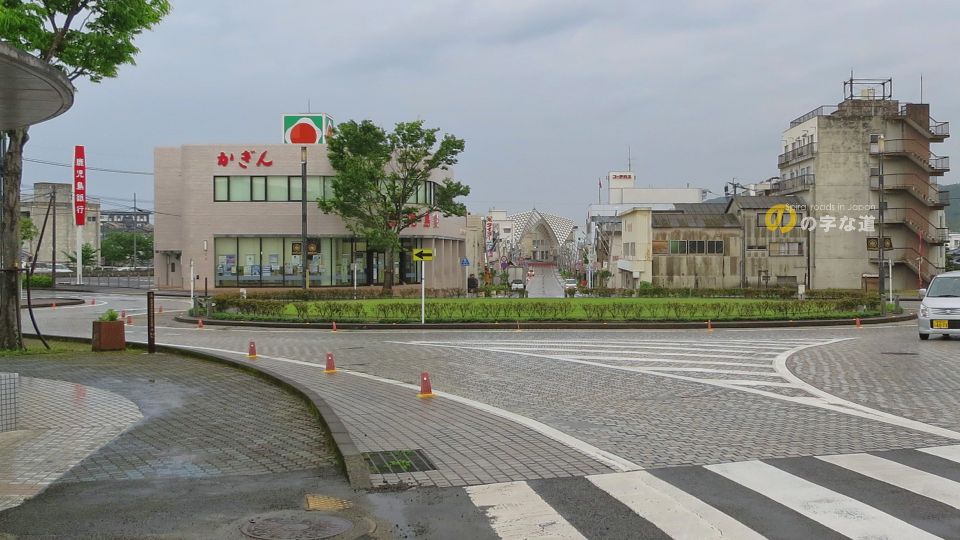 中央島の向こう側の道路(中央通り)の奥に見える傘は1991(平成3)年7月に完成した串木野ドリーム・キャノピー。