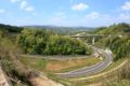 間遠跨道橋全景。法面崩落の復旧工事の邪魔にならない位置で撮影したので、のの字を描いている様子が伝わるかどうか。