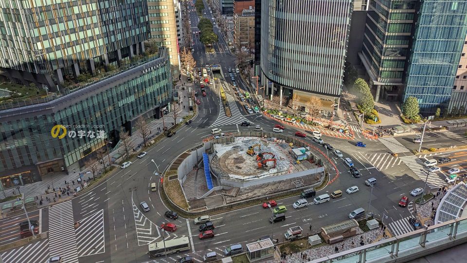 JRセントラルタワーズ15階の愛知県旅券センター前から眺める名古屋駅前ロータリー。この車線数なので環道上で車線変更はかなり難しく、初見殺しと言えよう。遥か向こうには昭和20年代にロータリー交差点が設置されていた泥江町(ひじえちょう)交差点が見える。