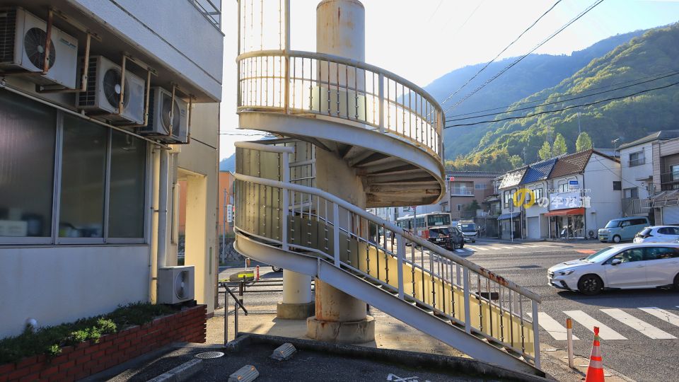 中八木横断歩道橋を西側から眺める。螺旋の昇降階段に合わせて医院の建物が凹んでいる。