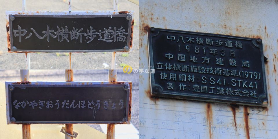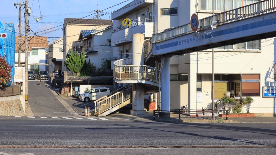 この付近一帯を校区とする八木小学校は可部線の東側にあり、通学の安全を確保するために横断歩道が架設されたと見られる。東側昇降階段のすぐ横にある医院の建物は昇降階段に合わせて切り取られたような形状をしている。分譲後に横断歩道橋を架設することが決定して調整を図った結果だろうか。