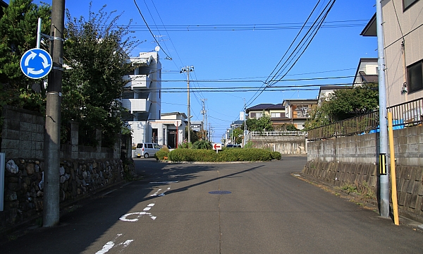 南東側から眺める。右のブロック塀が切れたところに、この家の駐車場出入口がある。環道走行中は、そこが駐車場であることに気付かない。とても危険な交差点だと感じる要因のひとつだ。