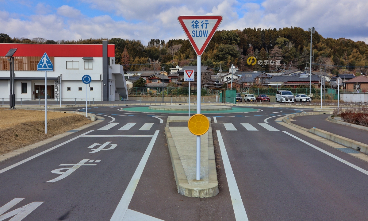 南側から眺める。規制標識「徐行(329-A)」だけでなく、自主規制標識「ゆずれ」も設置されている。いずれの接続路にも警戒標識「ロータリーあり(201の2)」は設置されていない。