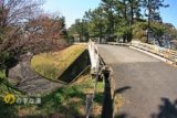 市道からループを構成する橋が見える。分岐地点にある標識は道路の形状をかなりリアルに表現している。