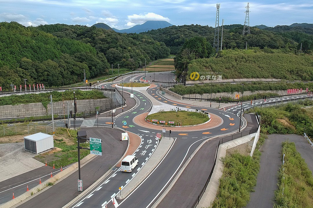 E9山陰道を構成する多伎・朝山道路は2006(平成18)年度に、朝山・大田道路は2007(平成19)年度に、それぞれ事業化された。両道路の接続点となる大田朝山ICをラウンドアバウトにして島根県道286号池田久手停車場線と接続すると発表されたのは2017(平成29)年3月。2つの中央島を持つツインラウンドアバウト採用ということで大きく話題になった。