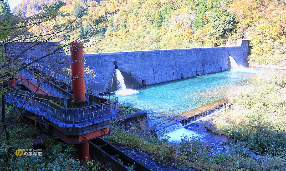 その他の特徴として、将来の土砂堆積を考慮して魚道出口(堤体貫通部分)を上下2箇所に設けていることが挙げられる。堰堤高は13m、魚道高さは約9m。