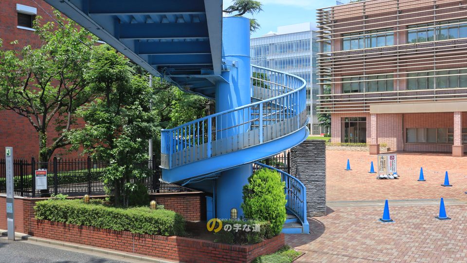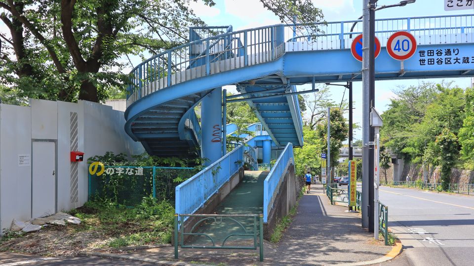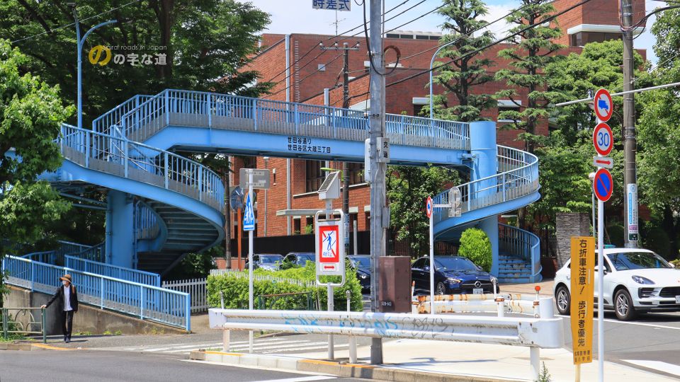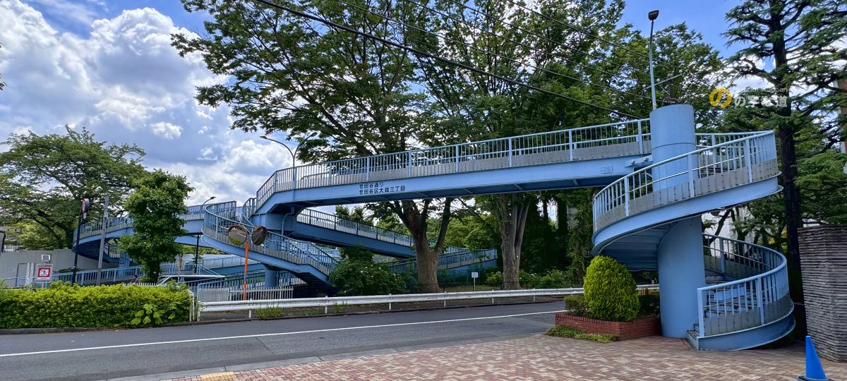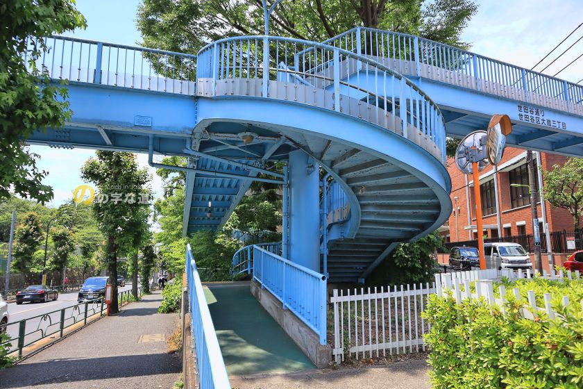 都立砧公園の北、日大商学部前交差点に架かる横断歩道橋の昇降階段がループしている。この交差点はY字形状で、歩道橋で都道と区道を一気に渡ることができる。
