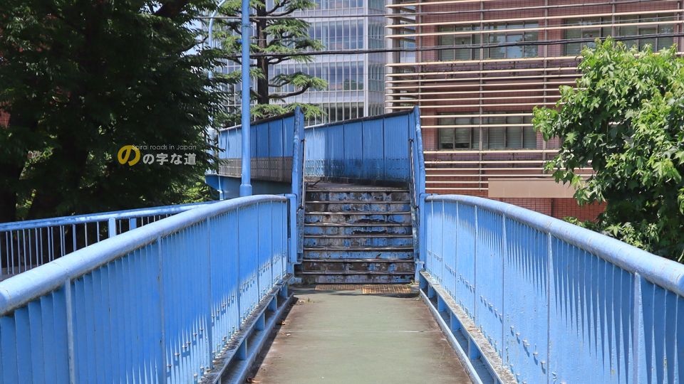 ただし、その床版高さは階段で変えているため、歩道橋の南半分は自転車通行可、北半分は歩行者専用ということになっている。そういうわけで「の」の字を描いているのは北側の昇降階段のみ、中央部と南側の昇降階段・斜路は完全な「の」の字ではない。