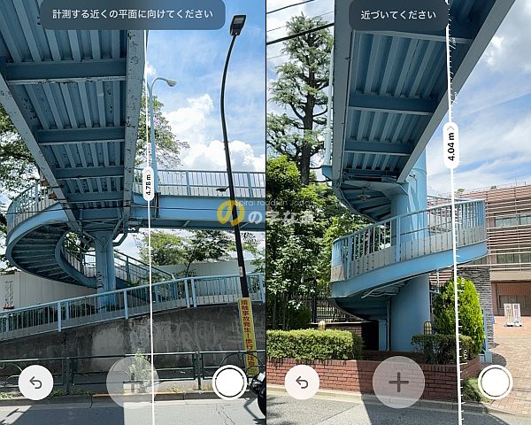 iPhoneの計測アプリで桁下高さを測ってみた。左が南側の桁下、右が北側の桁下だ。