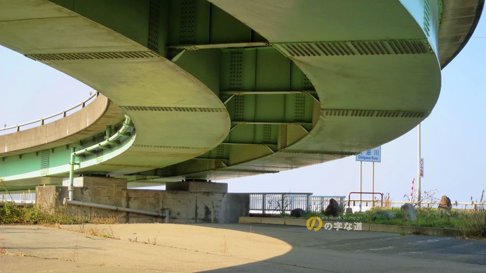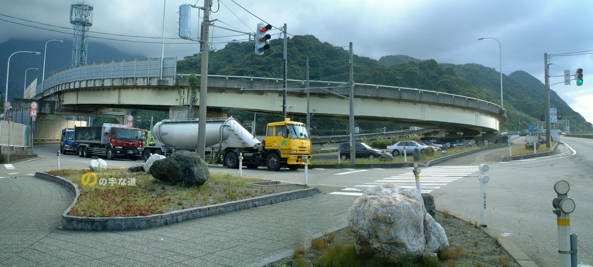 セメント等を作っている電気化学工業(現社名・デンカ)の青海工場(及び橋立翡翠峡)へつながる道。なので、ダンプやローリーが頻繁に通行する。海岸線に近いところを走るJR北陸本線(現・えちごトキめき鉄道日本海ひすいライン)を跨ぎ、それよりも海岸線を走る国道8号に接続するので、緩勾配にするためにループさせるしかなかったのだろう。